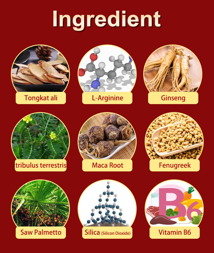 Ingrediente principal:Tongkat ali. , L-Arginine, Ginseng, tribulus terrestris, Maca Root, Fenugreek, Saw Palmetto, Silica (Silicon Dioxide), Vitamin B6.