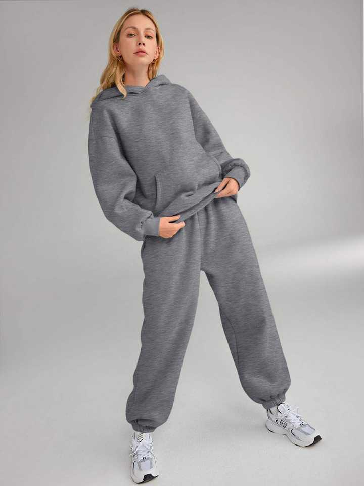 Conjunto Deportivo Personalizado de Invierno, Corte Cuadrado, Color Sólido, 360 Gsm, Felpa de Poliéster y Algodón, Mangas Largas, Gris Oscuro, Informal, para Mujer