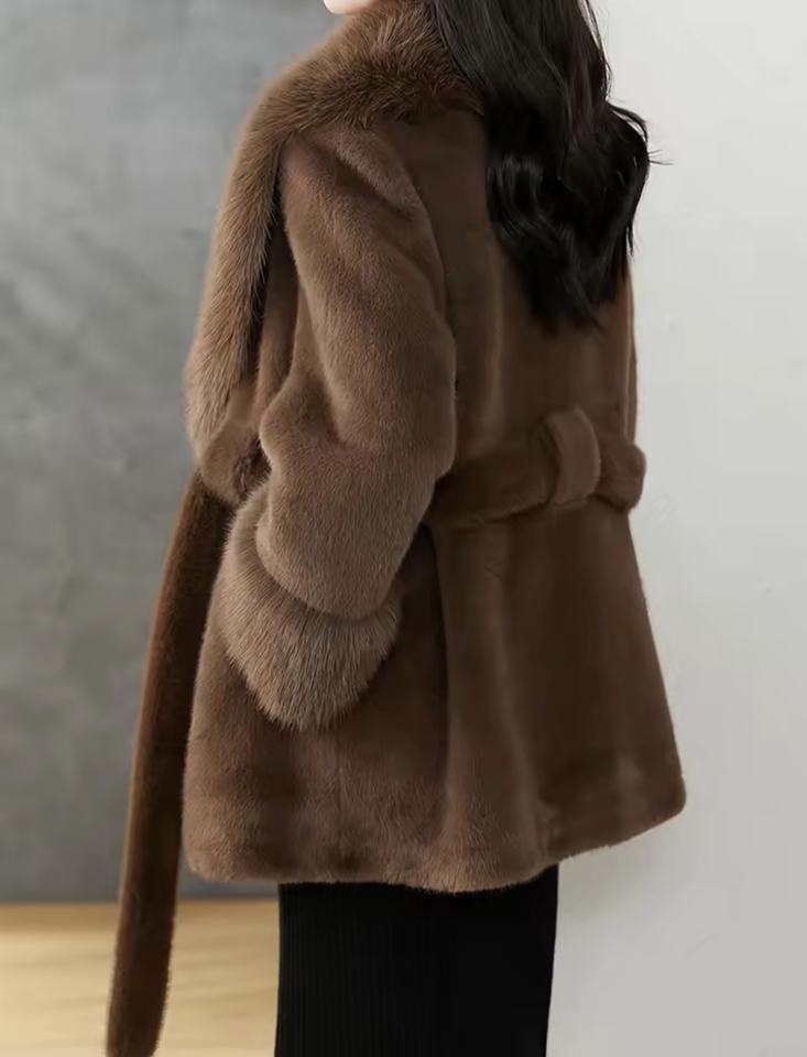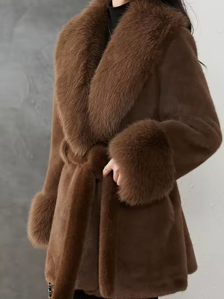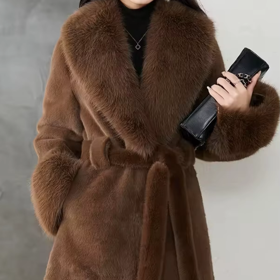 Abrigo de hierba de piel de conejo de nutria de imitación de Invierno para mujer, cuello y puños de piel de zorro, chaqueta adelgazante con diseño de cinturón con cuello en V grande