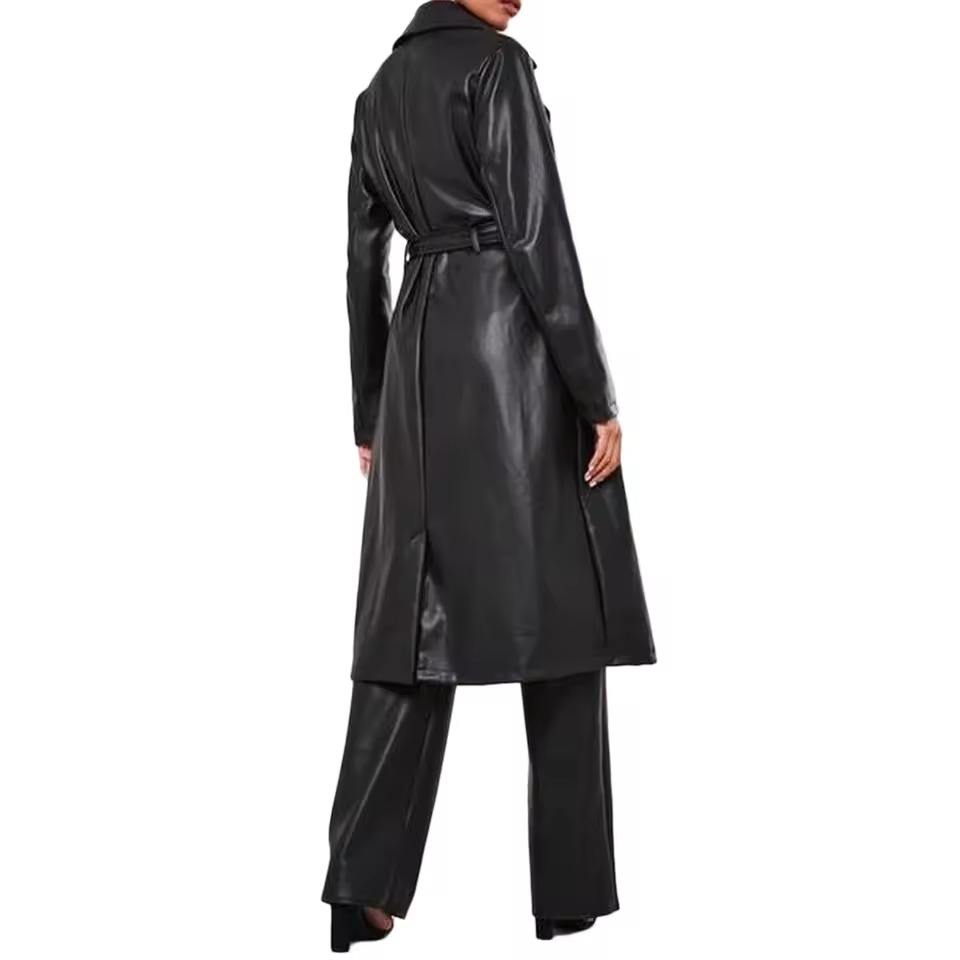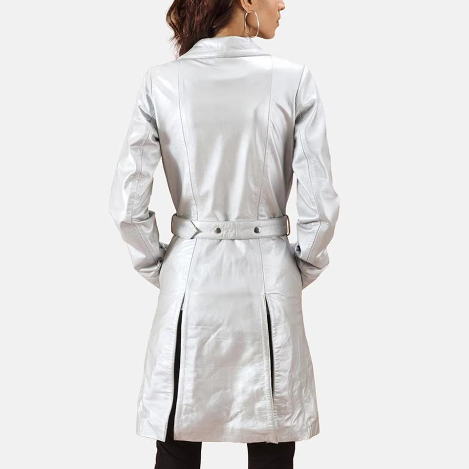 Recién llegado de invierno, gabardina corta de piel sintética metálica plateada futurista para mujer con lazo en la cintura con acabado brillante