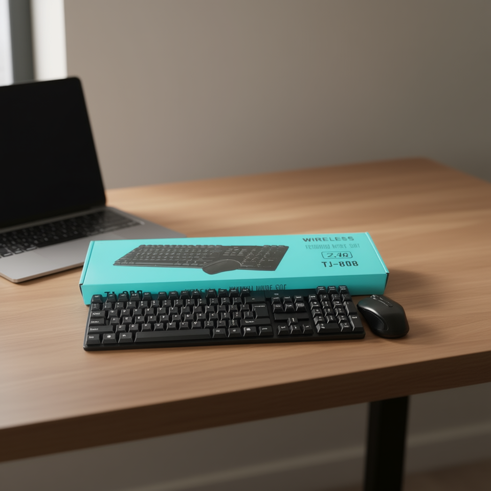 Combo inalámbrico teclado y ratón estándar para PC, color negro, material ABS, conectividad USB, 104 teclas, modelo TJ-808, requiere 2 pilas AA