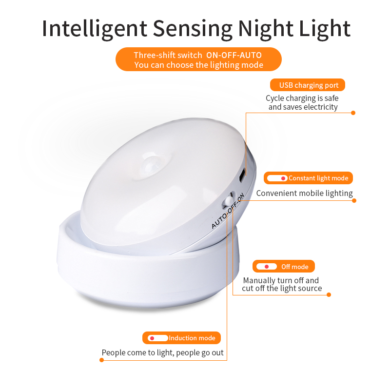 Luz Nocturna LED Inalámbrica con Sensor de Movimiento, Material ABS, Carga USB, Lámpara de Noche para Gabinete, Mesita de Noche, Dormitorio, Armario