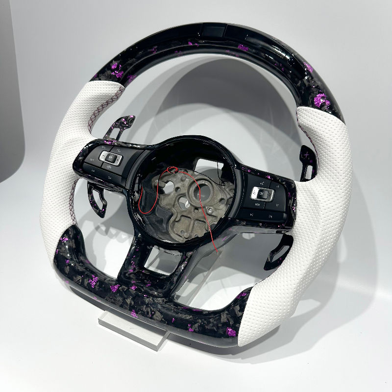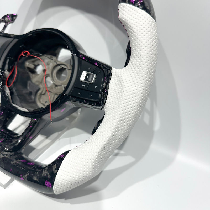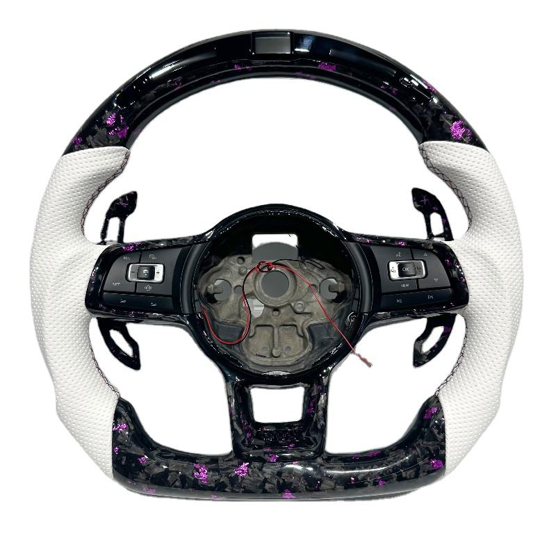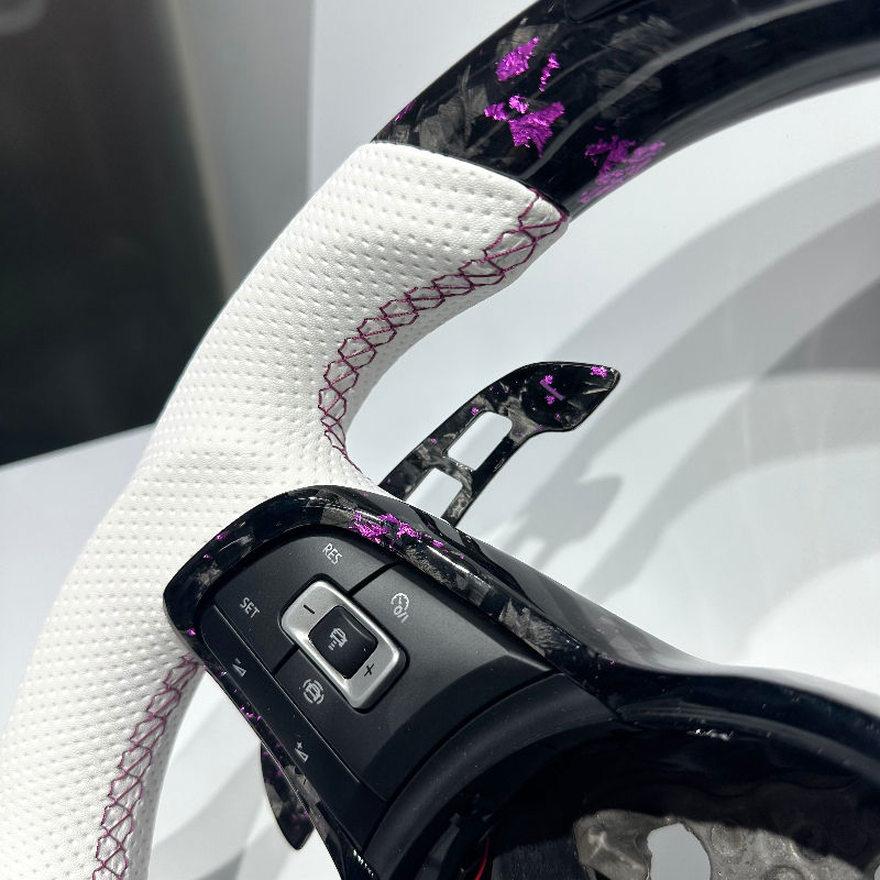 Volante Deportivo con Levas de Cambio, LED, Fibra de Carbono Forjada Morada, Cuero Blanco Perforado, Apto para MK7 MK6 MK5 Golf