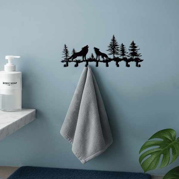 Colgador de pared rústico con forma de lobo y 8 ganchos para llaves, sombreros y bufandas - Organizador para recibidor, pasillo, dormitorio y baño