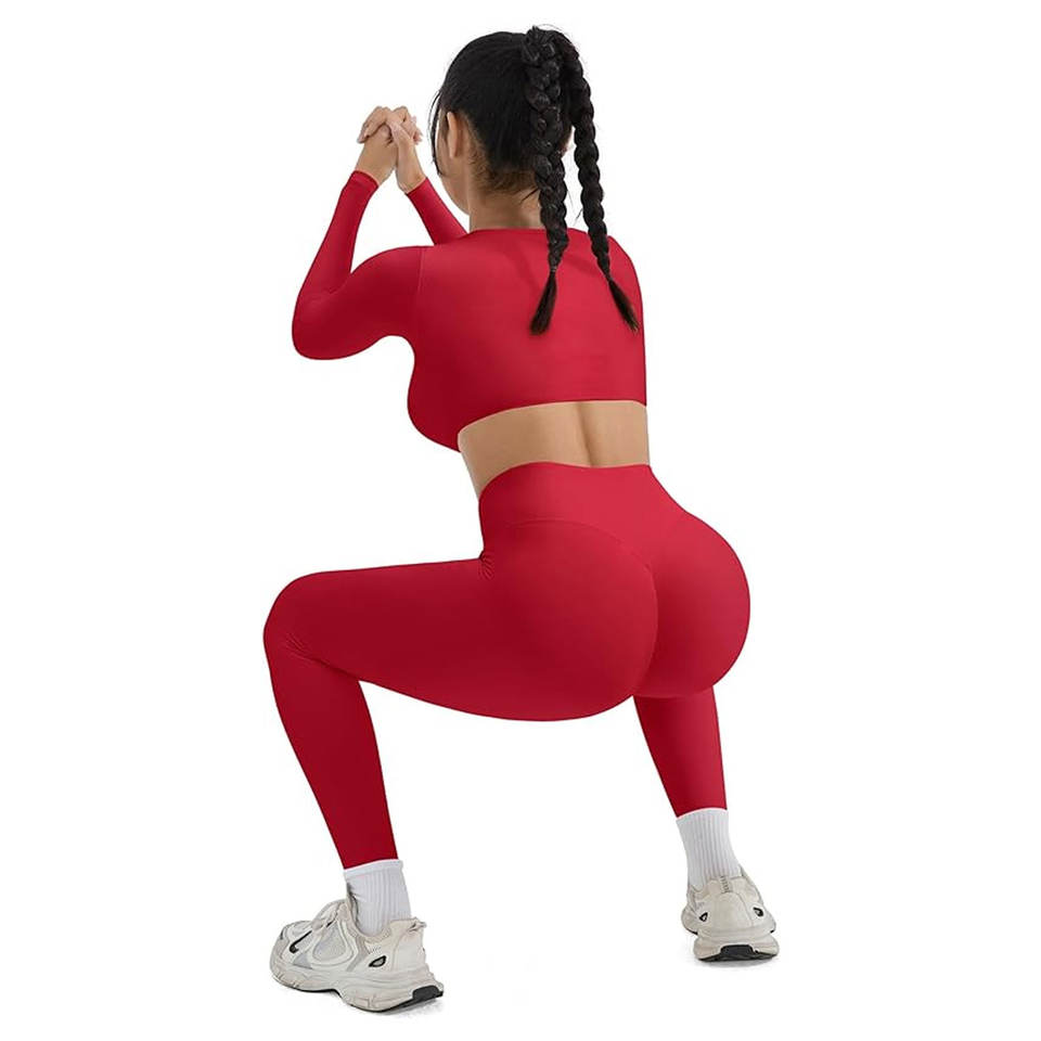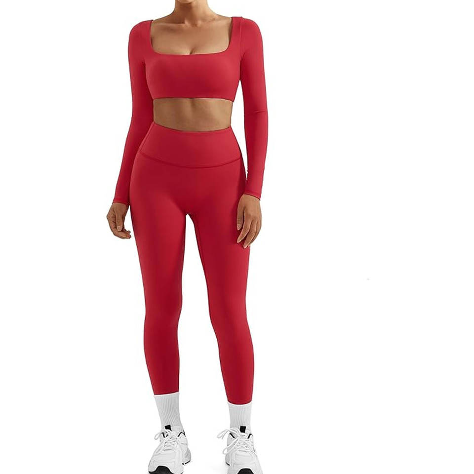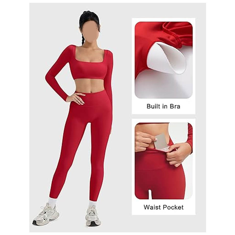 Conjuntos Deportivos de 2 Piezas para Mujer, Leggings de Compresión con Control de Abdomen y Bolsillos, Top Corto Acolchado de Manga Larga con Cuello Cuadrado, Ropa Deportiva