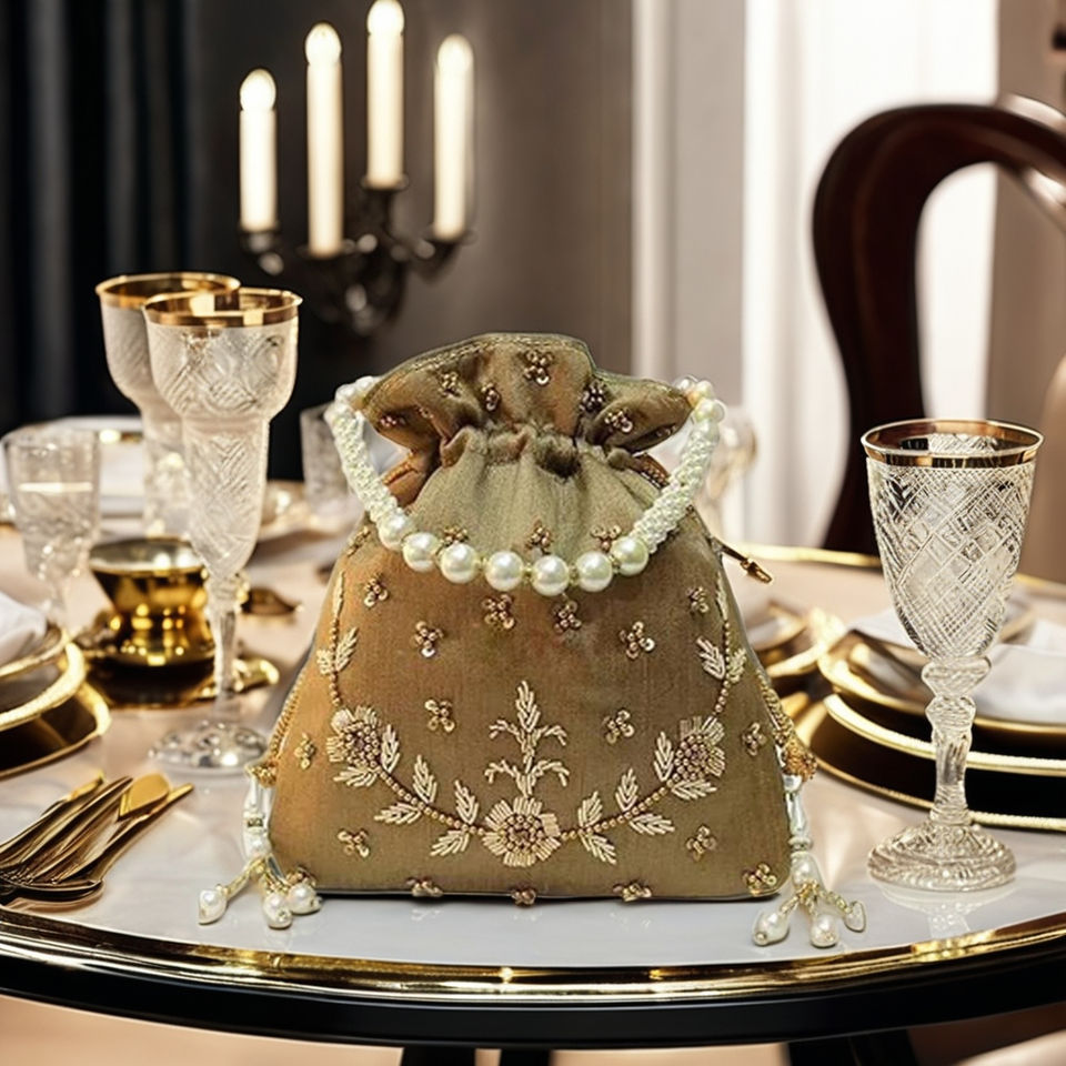 Mini bolso de mano a la moda para mujer, bolso Potli, Perla de seda y Zardosi, bordado, cierre de cordón de noche
