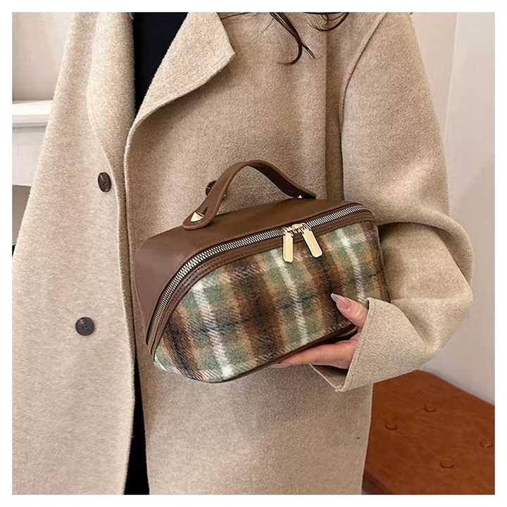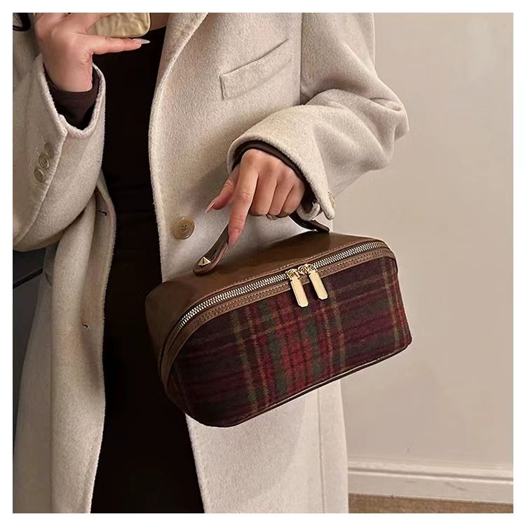 Neceser de viaje a la moda para mujer, bolsa de almacenamiento, embalaje, cuidado de la piel, almacenamiento de joyas, bolsa de maquillaje cosmético a cuadros de lana