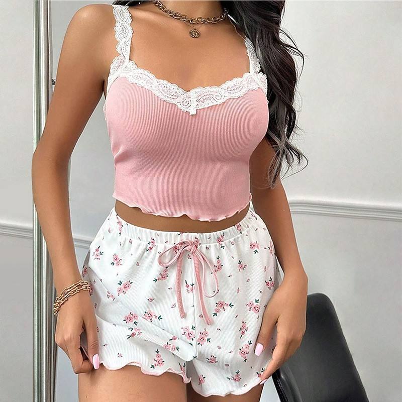 Conjunto de pijama para mujer, ropa de dormir con cuello en V y encaje, camisola sexy, pantalones cortos estampados, pijamas suaves, ropa de estar por casa