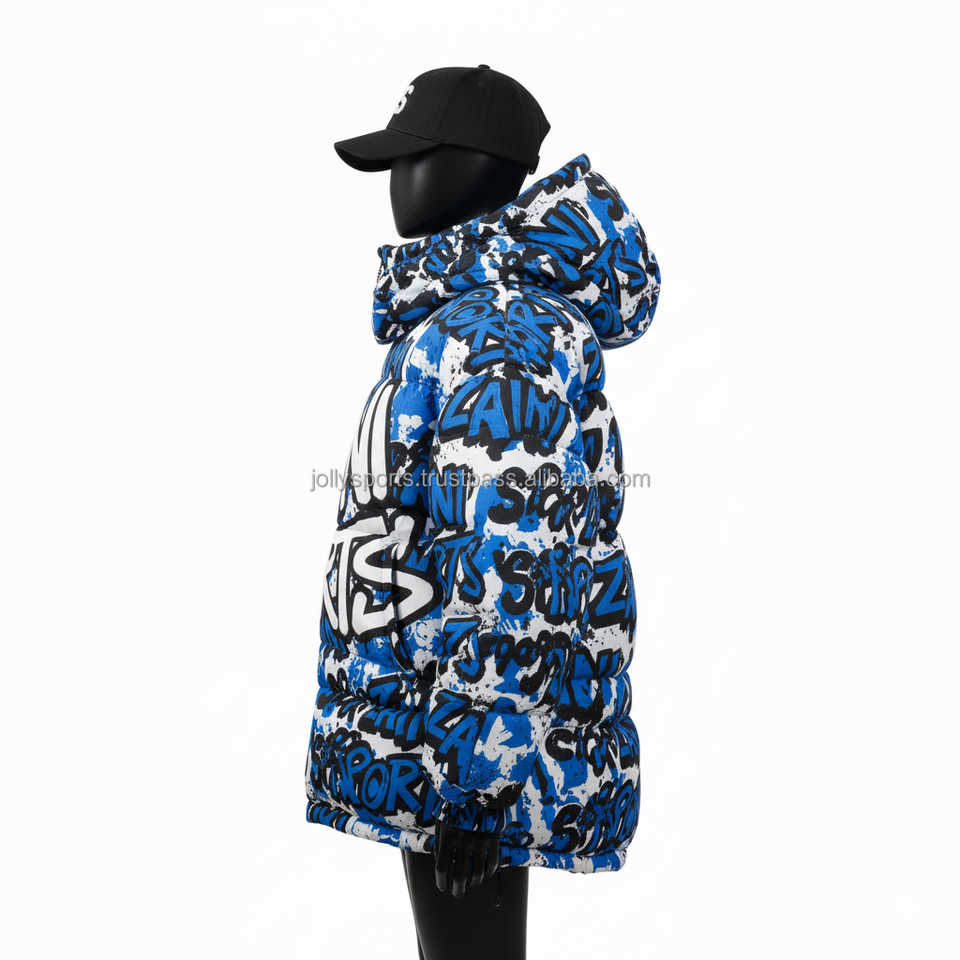 Chaqueta acolchada para mujer, tela de poliéster de primera calidad, estampado de grafiti azul y blanco, estilo callejero, chaqueta bordada con logotipo personalizado para mujer