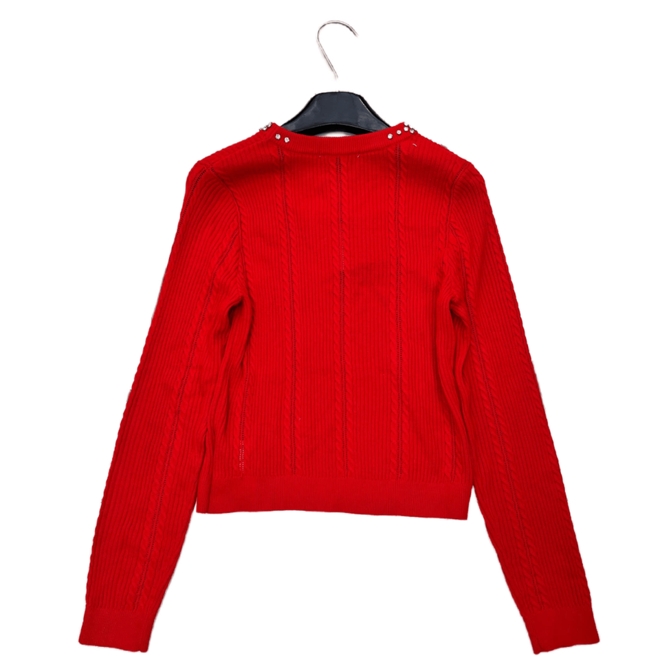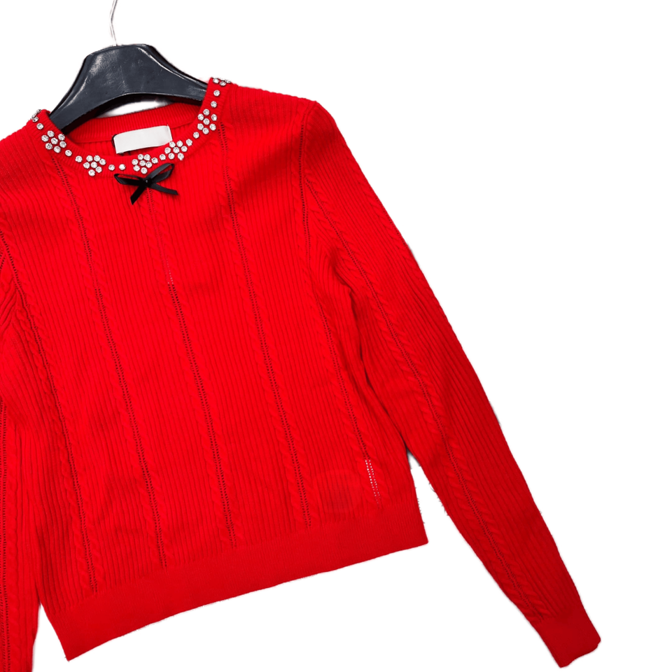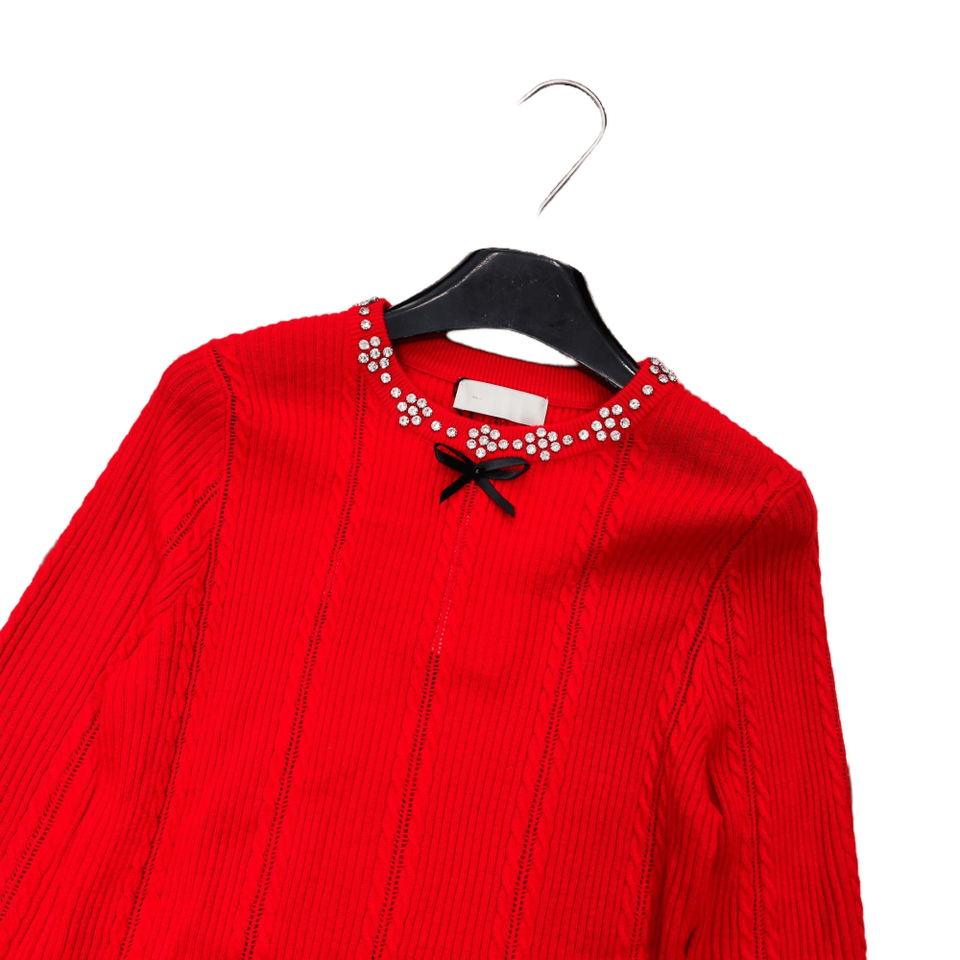 Suéter de punto acanalado con detalle de lazo de diamantes de imitación para mujer, top informal de manga larga con cuello redondo