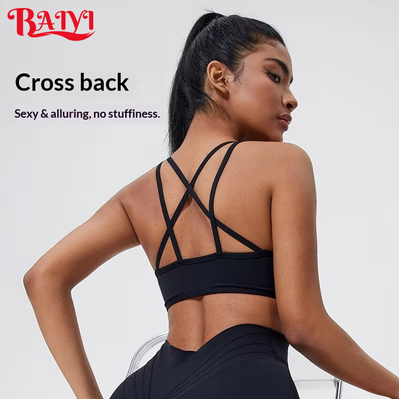 Sujetador deportivo fruncido con espalda cruzada para mujer, con almohadillas extraíbles, alta elasticidad, transpirable, para yoga y gimnasio, con logo personalizado, ropa interior de fitness para entrenamiento