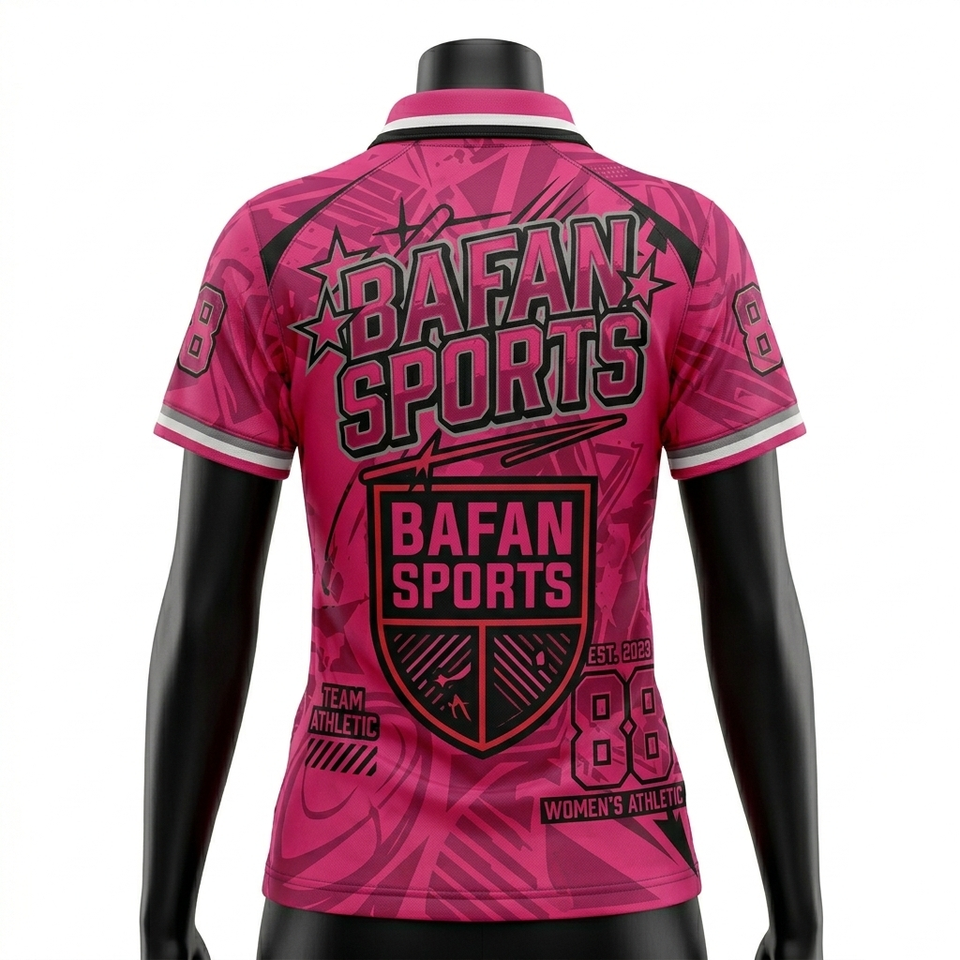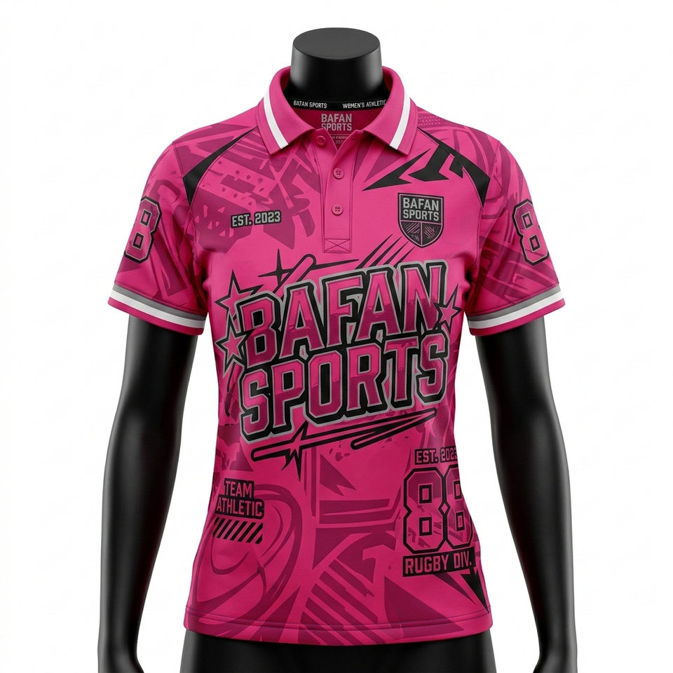 Camiseta de Rugby para Mujer, Poliéster, Diseño Gráfico con Paneles Rosas, Sublimación, Logotipo Personalizado, Camiseta de Rugby de Algodón para Mujer