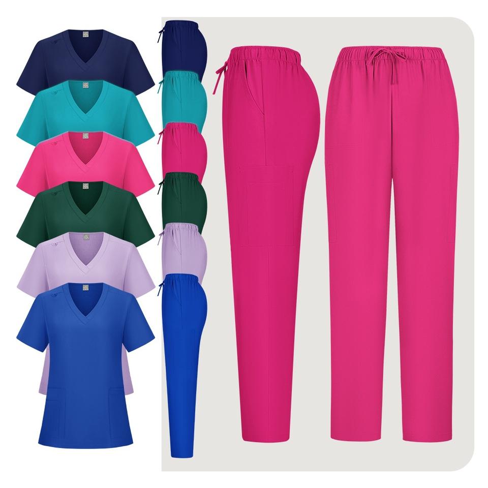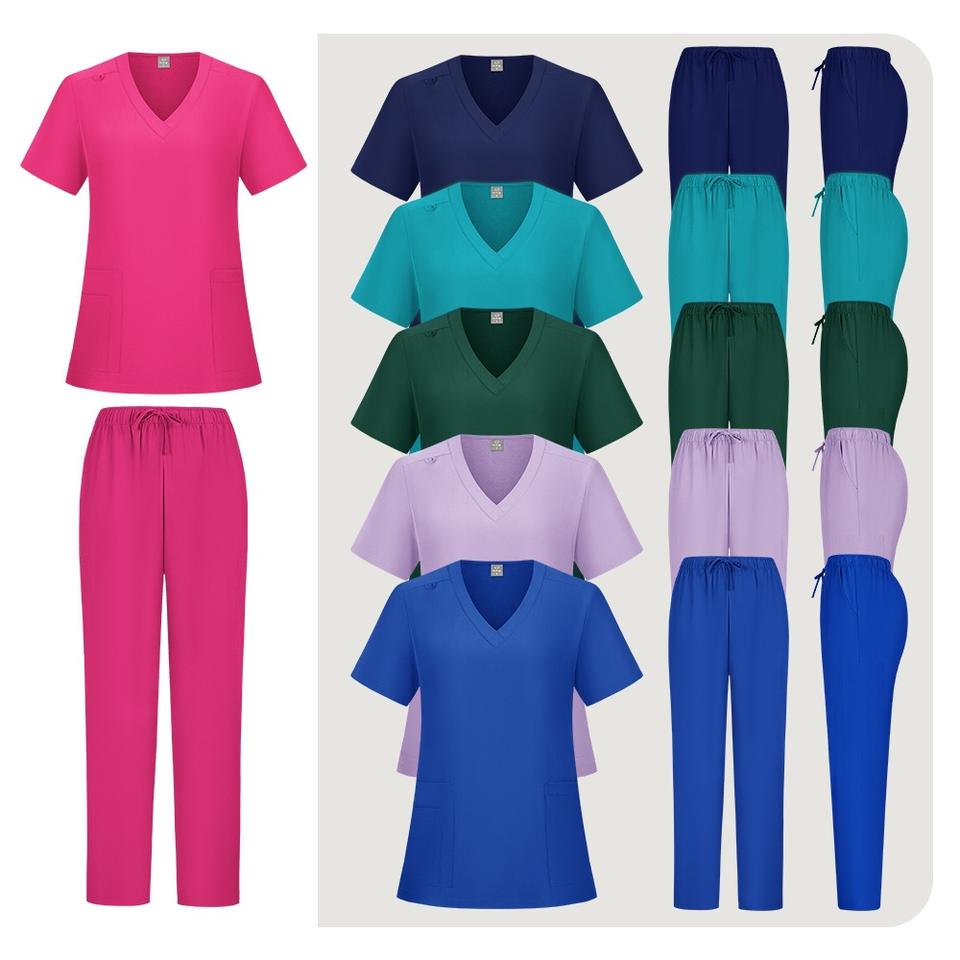 Women Scrub Set Solid Color V-Neck Top And Straight Leg Pants Moisture Wicking Hospital Uniforms Split Set S XXL