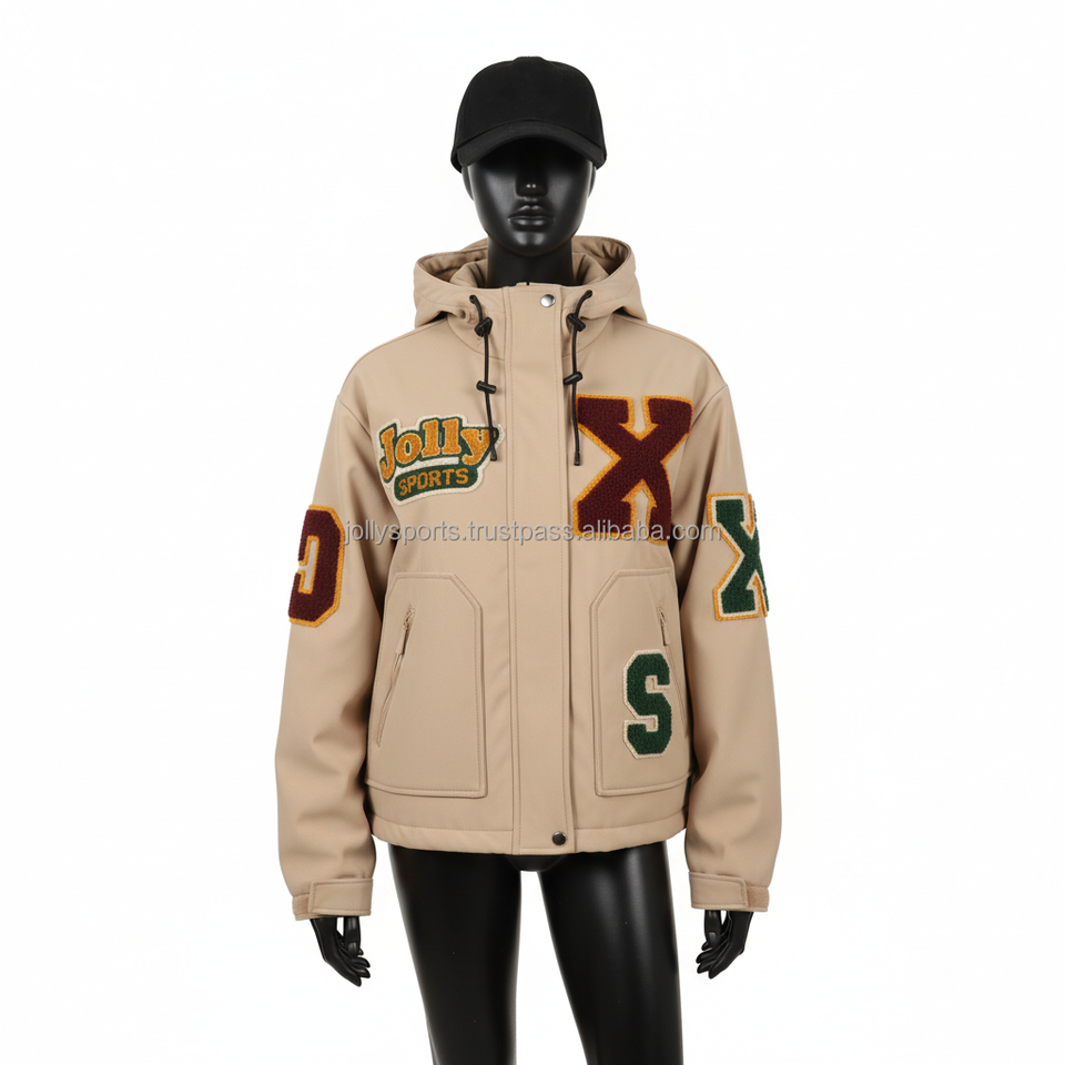 Chaqueta Softshell para mujer, tela duradera resistente al agua, Color Beige, logotipo personalizado, diseño bordado de chenilla, chaqueta Softshell para mujer