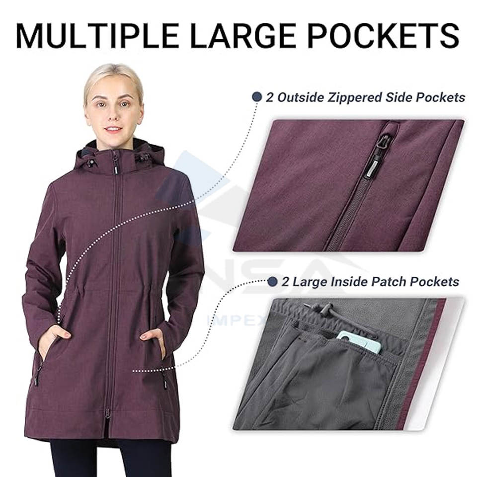 Chaqueta Softshell para Mujer, con Capucha Desmontable, Forro Polar, Larga, Cálida, Impermeable, Cortavientos, Color Rojo Púrpura Jaspeado