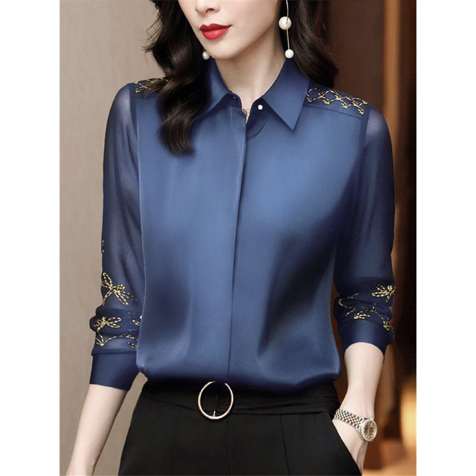 Blusas y Camisas de Gasa de Manga Larga para Mujer con Decoración de Encaje, Bordado, Cuello Camisero, Azul, Primavera/Otoño, Tallas 4XL