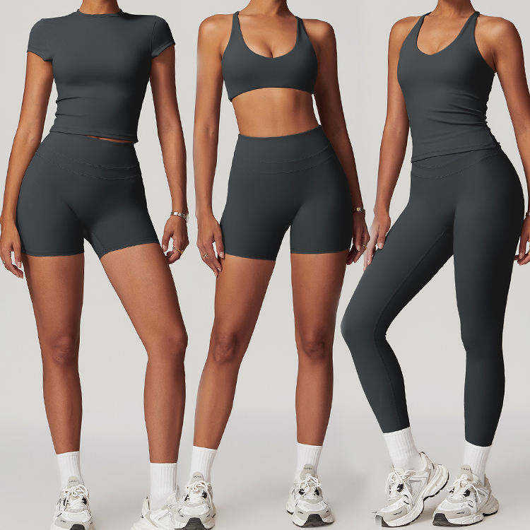 Conjunto Deportivo de Tres Piezas para Mujer, Top Corto Negro Elástico, Camiseta sin Mangas y Leggings Ajustados, Ropa Deportiva
