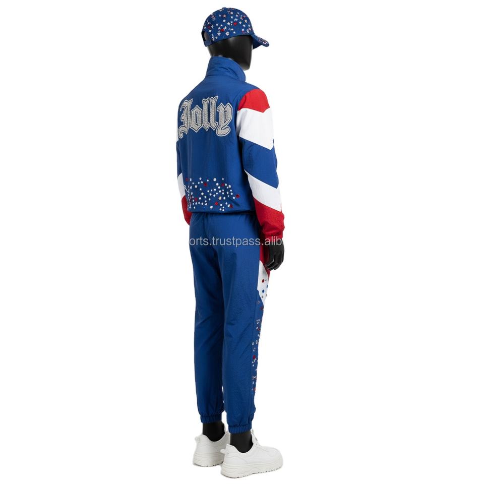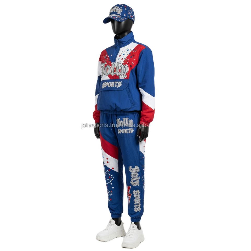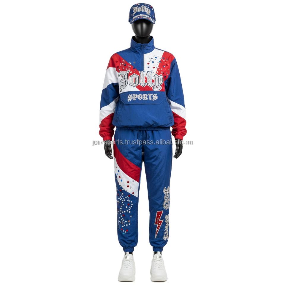 Conjunto de cortavientos para mujer Premium 150GSM Ripstop Poliéster Bloque de color Azul Rojo Blanco Logotipo de diamantes de imitación personalizado Cortavientos de talla grande