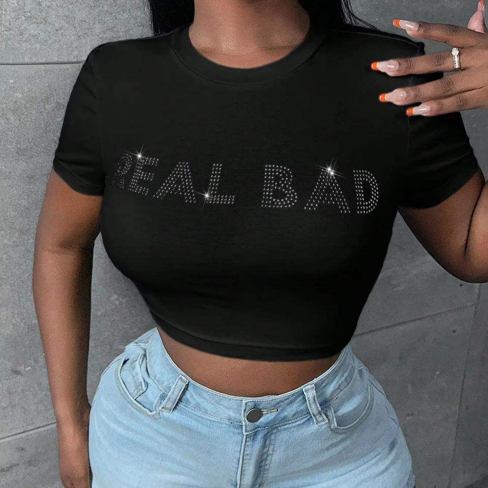 Camiseta Corta de Mujer Estilo Y2K con Pedrería, Ajustada, de Manga Corta, de Algodón, Informal, con Estampado Gráfico Brillante, para Verano