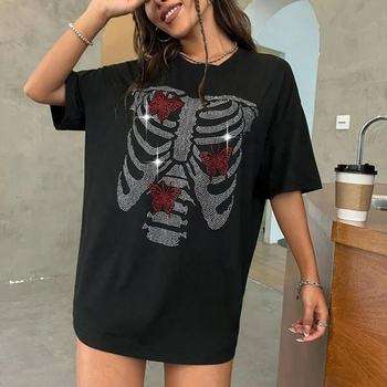 Camiseta Oversize de Algodón con Letras de Diamantes de Imitación Y2K para Mujer, Manga Corta, Estilo Casual Urbano