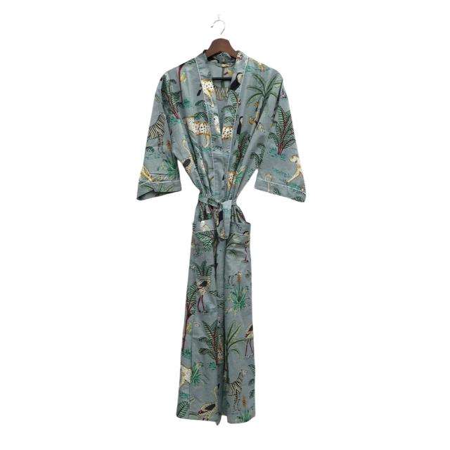 Kimono con estampado de jungla de algodón 100% para mujer, la mejor calidad, ropa de vacaciones relajante informal india, ropa de dormir de verano y primavera