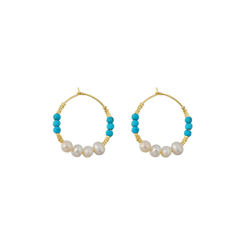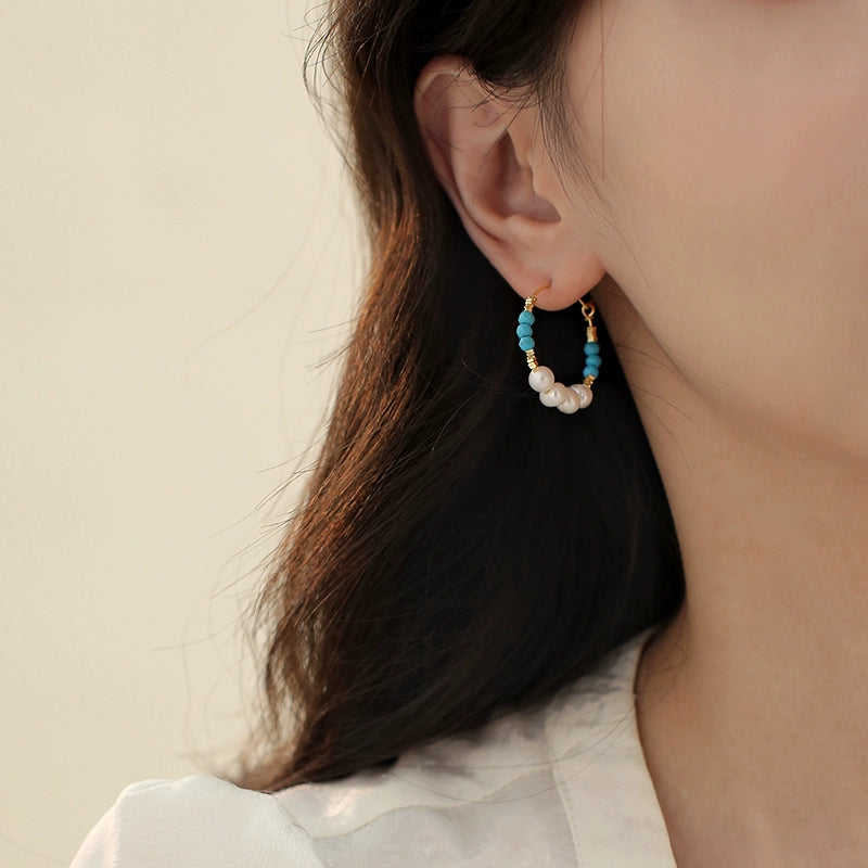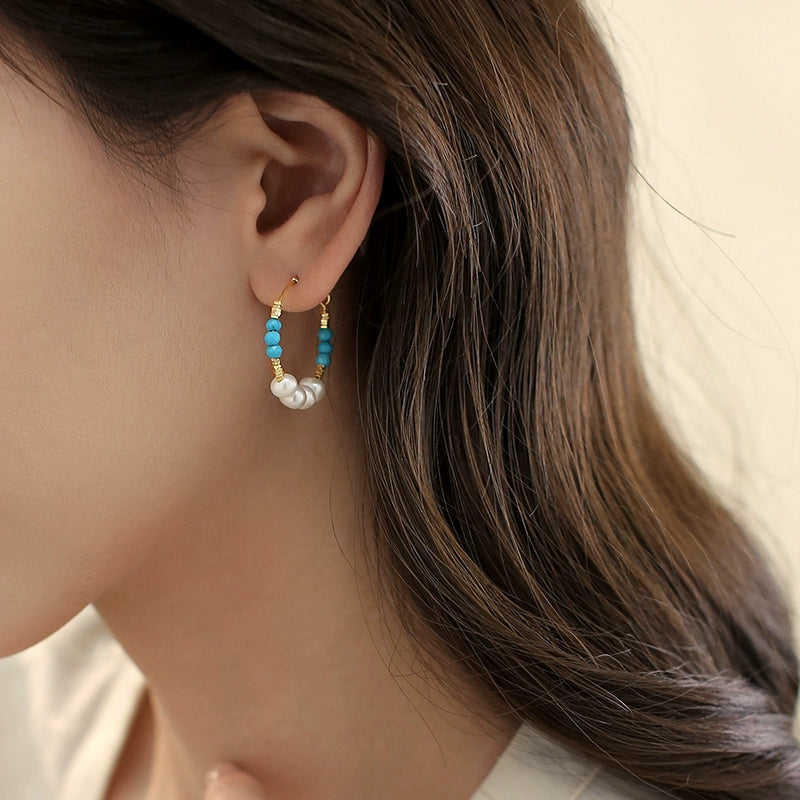 Pendientes de Perlas Naturales 1579 para Mujer, Aros Huggie Turquesa con Latón Chapado en Rodio, Estilo Clásico con Diamantes y Circonita como Piedra Principal