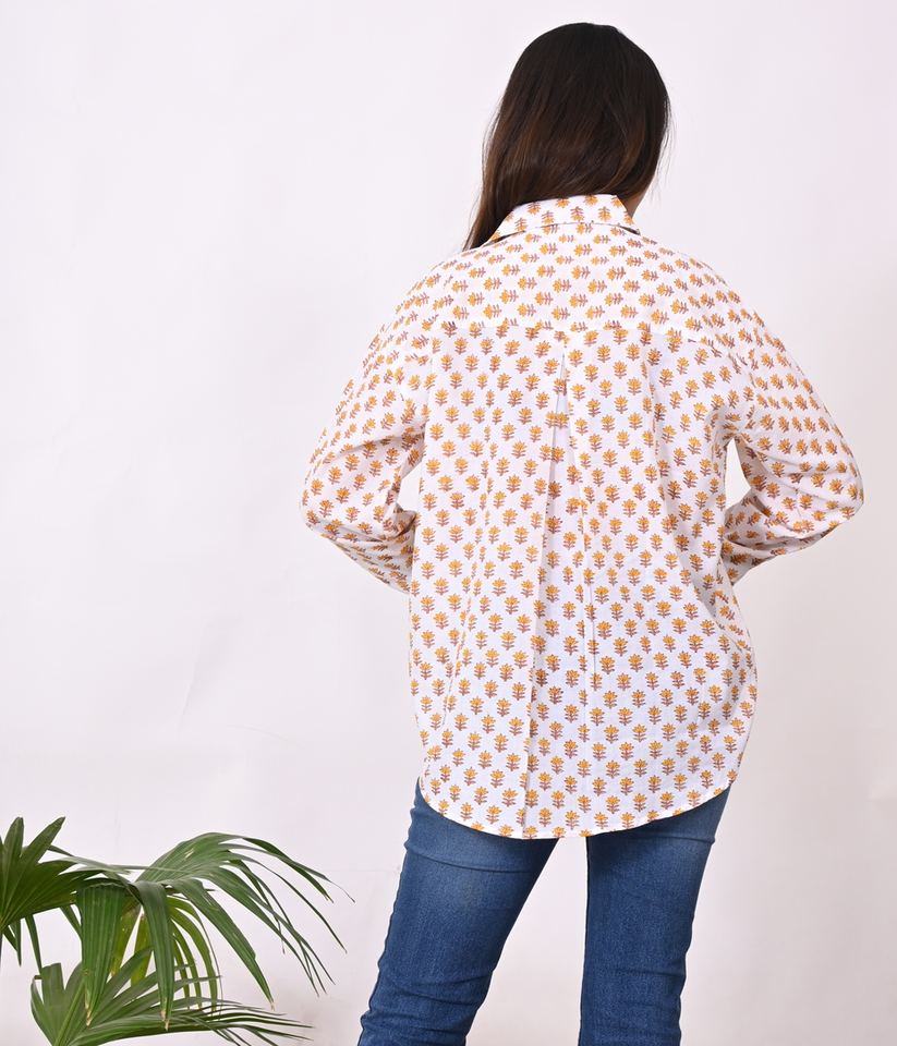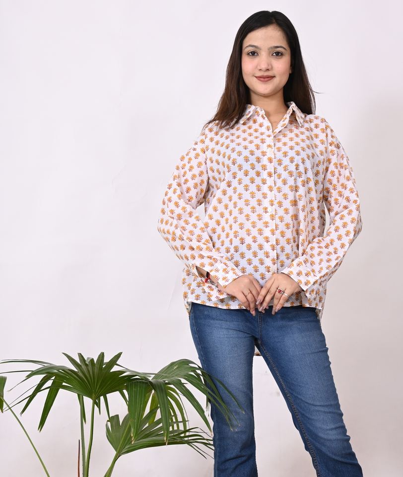 Blusas básicas de algodón con estampado de bloques a mano para mujer, blusas con botones de manga larga con cuello vuelto para verano