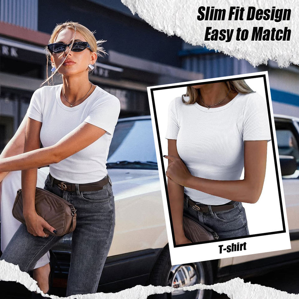 Camiseta Básica de Cuello Redondo Acanalado para Mujer, Manga Corta, Ajustada, Informal, para Uso Diario y Estilo Urbano