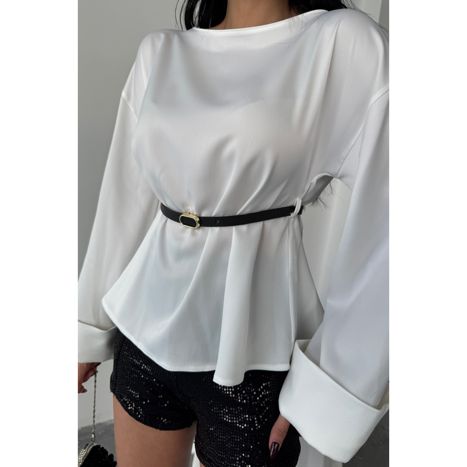 Blusa de Satén con Cinturón para Mujer en Blanco, Blusa Larga Formal de Gasa y Popelina con Bordado Floral y Decoración de Encaje, Tallas XS a XL