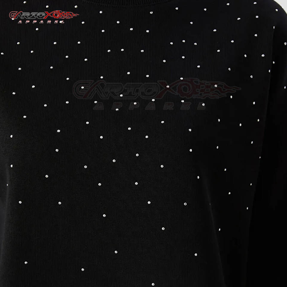 Sudadera con diamantes de imitación ostentosos para mujer con estilo glam y sudadera con detalles de diamantes de imitación de tela interior suave