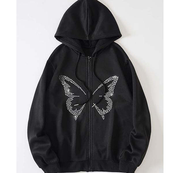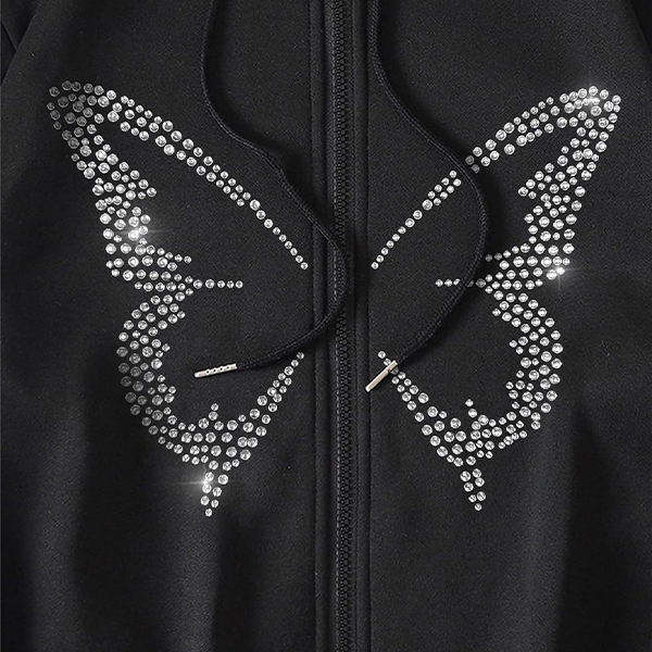 Sudadera con capucha y cremallera para mujer, con diseño de alas de mariposa y pedrería, 2026, negra brillante, oversize, estilo Y2K, ropa urbana, forro polar suave, prenda exterior informal HD