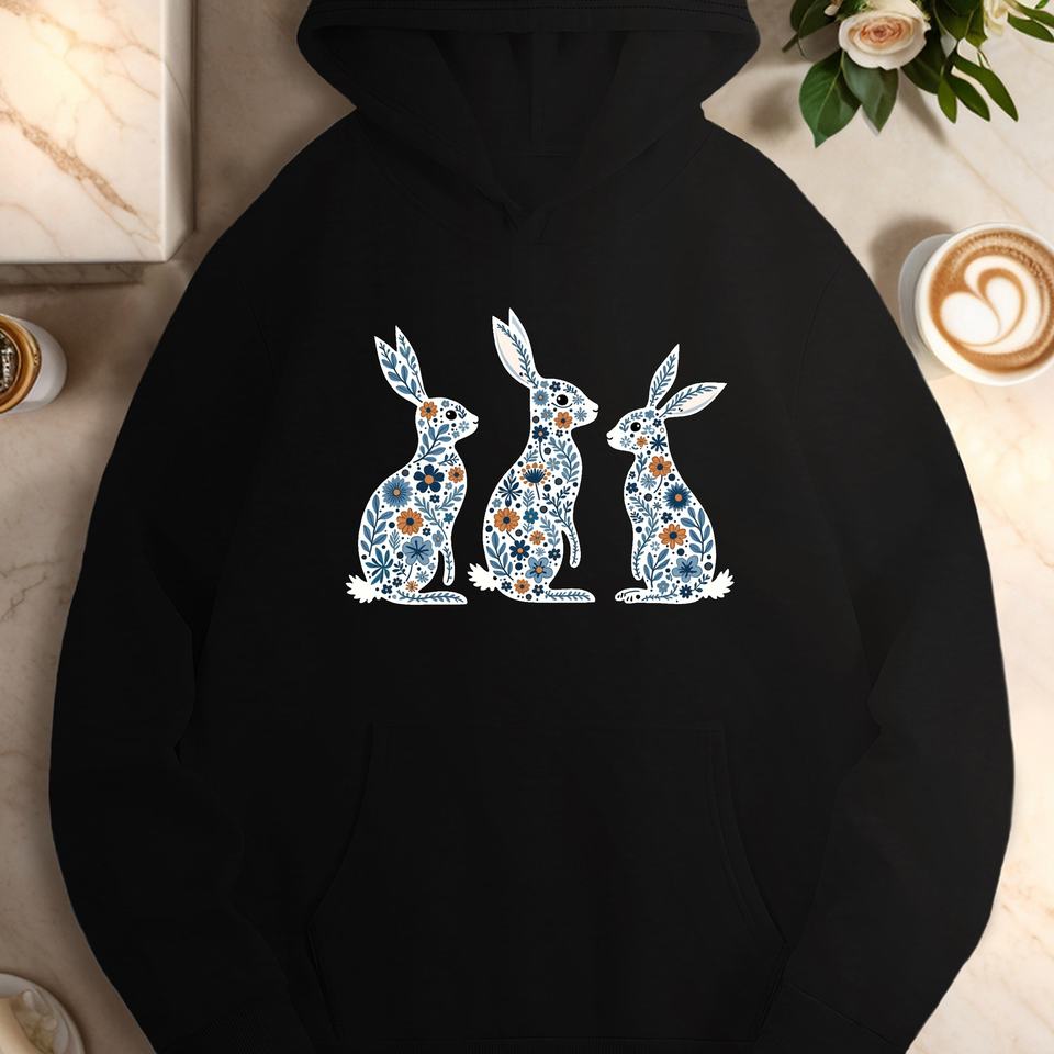 Sudadera con capucha de siluetas de conejo floral informal para mujer Tela de punto con estampado intrincado