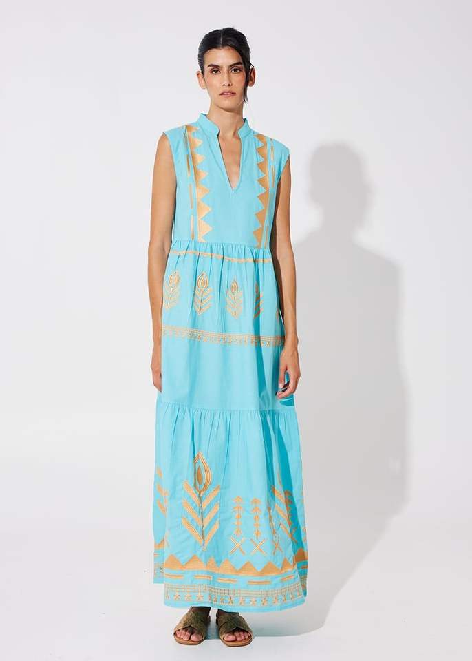 Vestido largo informal de lino con cuello en V para mujer, borla bordada, manga corta, logotipo Digital personalizado, espalda Natural, venta al por mayor del fabricante