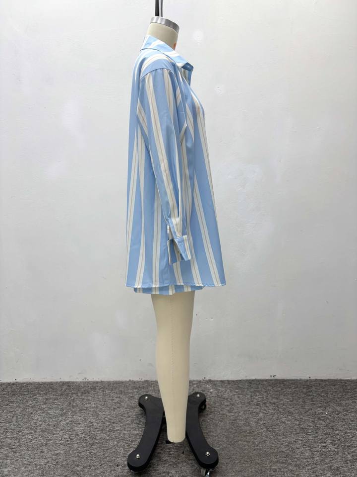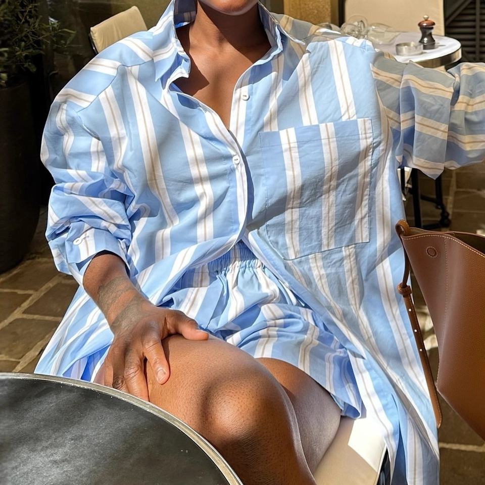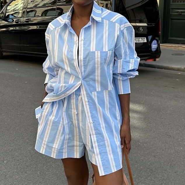 Conjunto de 2 Piezas de Moda para Mujer: Camisa de Manga Larga con Cuello y Rayas en Bloques de Color y Pantalones Cortos Casuales Versátiles de Estilo Africano