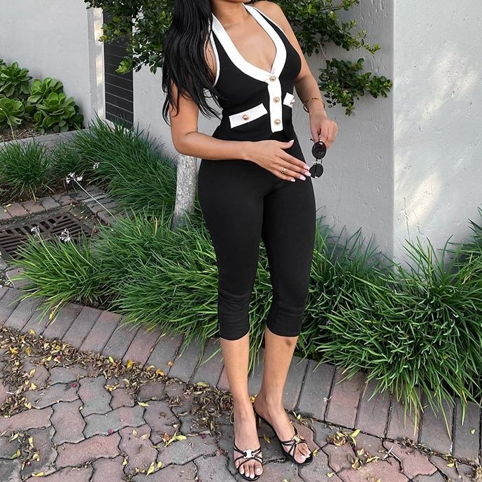 Conjunto de 2 piezas de moda para mujer: Top halter sin espalda con cuello en V y hebilla dorada en bloques de color y pantalones ajustados de 7/8 de largo