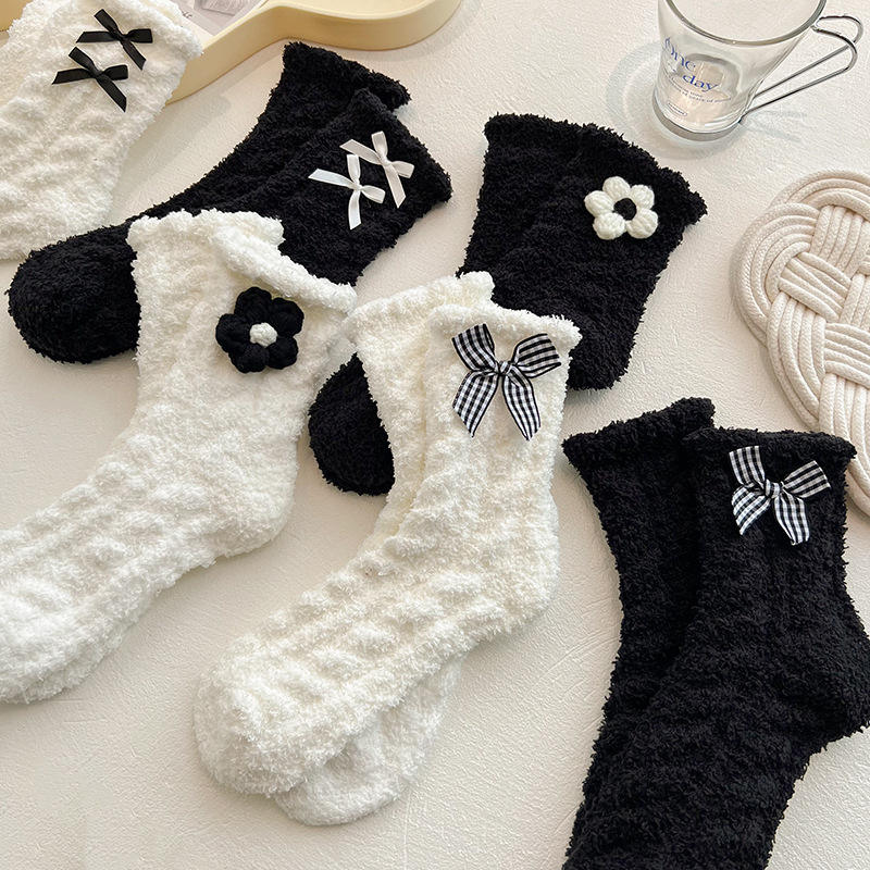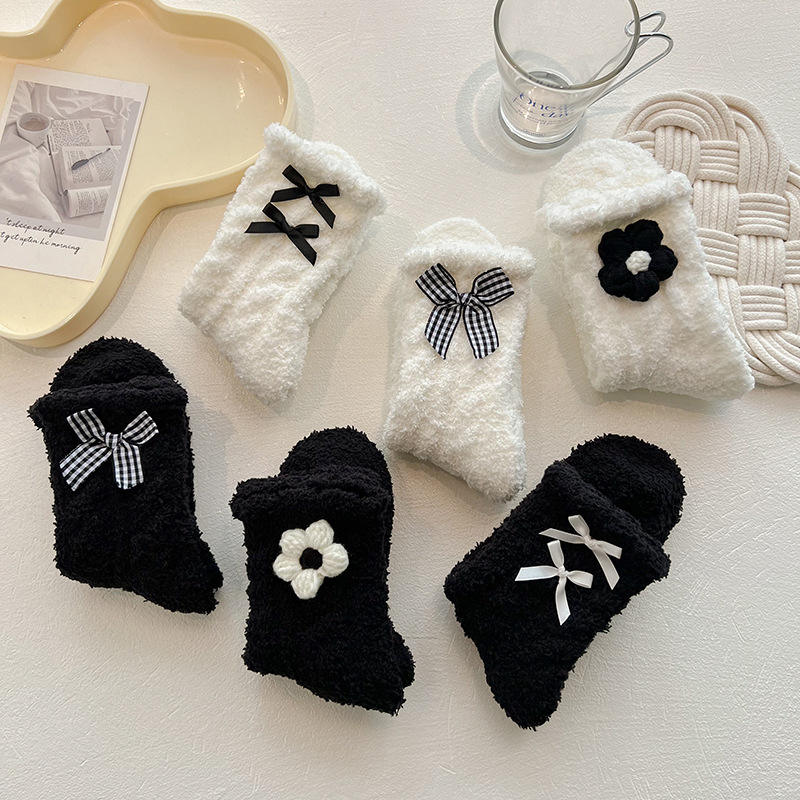 Nombre del Producto:Calcetines de Forro Polar Coral para Mujer con Lazo y Flor, Gruesos para Otoño e Invierno.