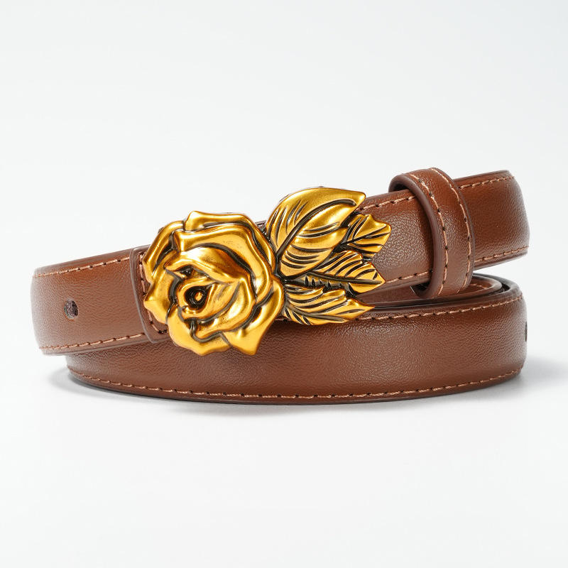 Cinturón de cuero genuino de piel de vaca para mujer con hebilla de aleación de diseño rosa dorada hecha a mano en Pakistán 1,8 CM de ancho 105CM de longitud