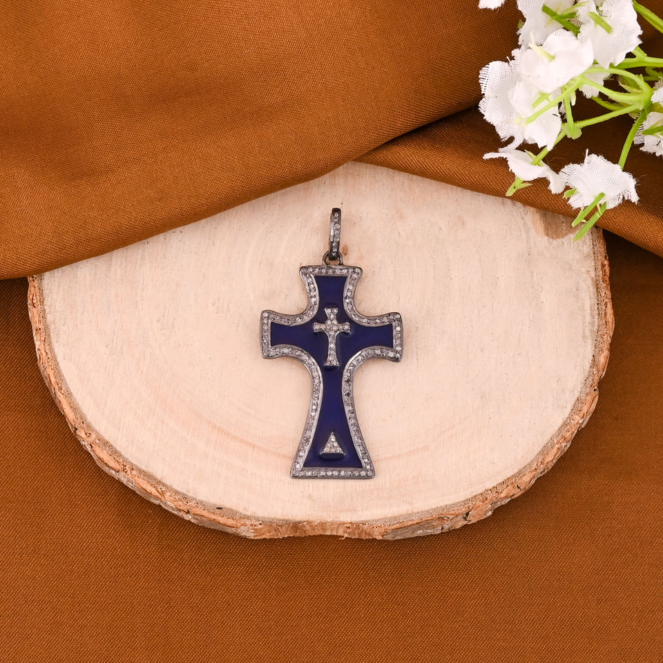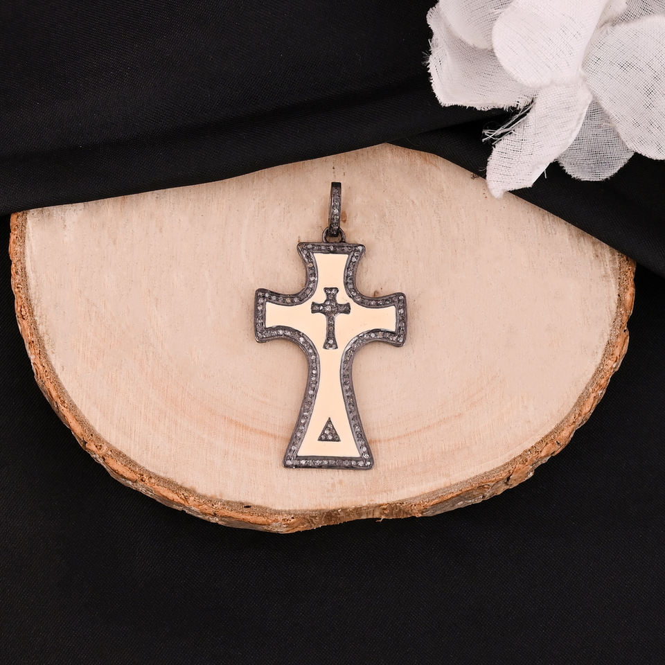 Colgante de Diseño Cruzado para Mujer, Plata de Ley 925, Bañado en Rodio Negro, Diamante Natural con Incrustaciones, Estilo Vintage, Tamaño 45x25 mm