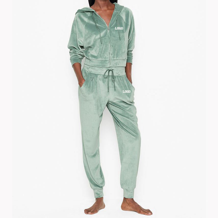 Conjunto de chándal de terciopelo de color personalizado para mujer, conjunto de dos piezas con sudaderas con cremallera y pantalones, chándales de terciopelo transpirables para invierno
