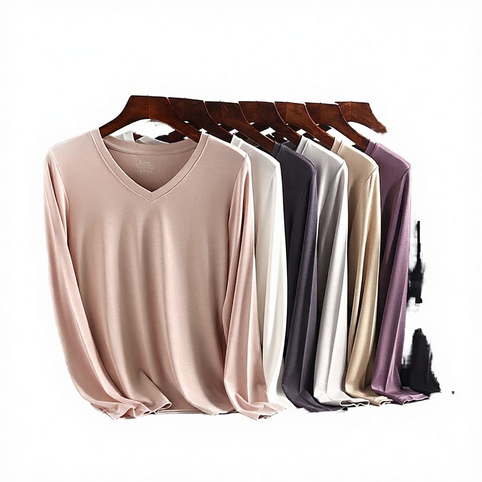 Camiseta de Manga Larga con Cuello en V para Mujer, Talla Grande, Personalizable, 95% Modal, 5% Elastano, Transpirable, Informal, Ligera, Básica, para Combinar en Capas