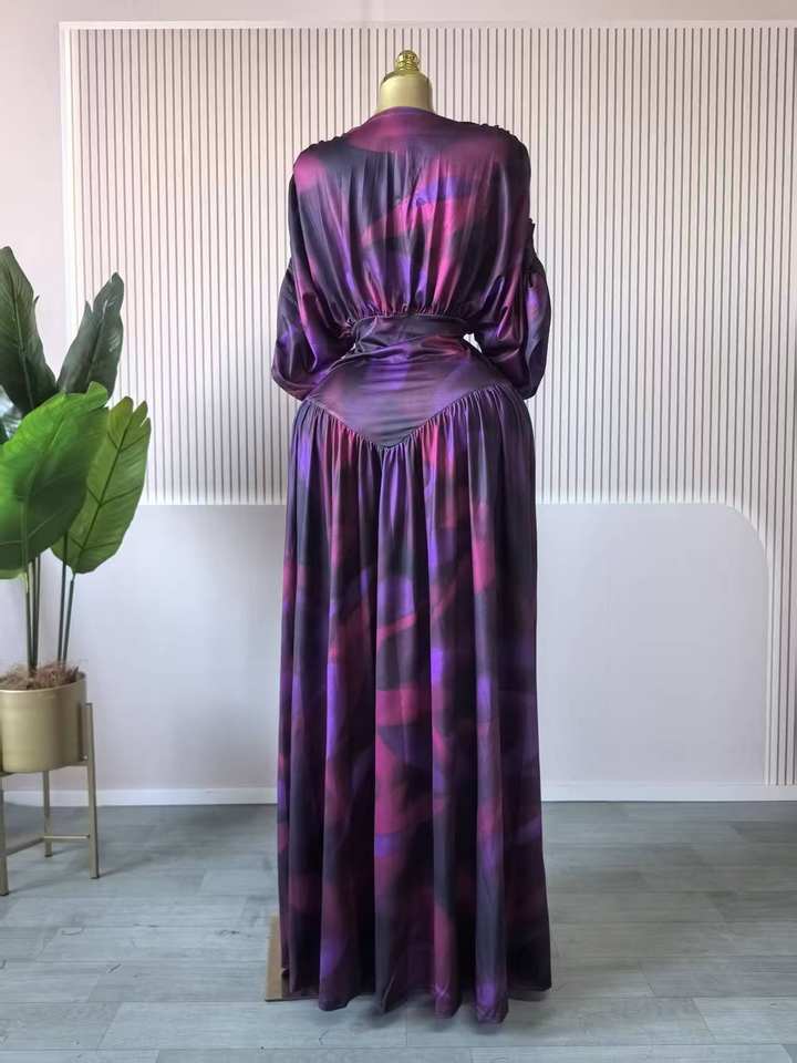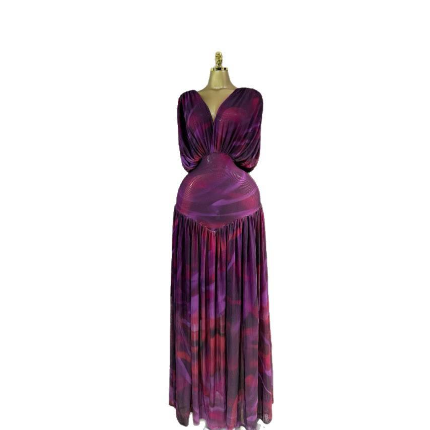 Vestido Maxi con Cuello en V Profundo y Cintura Fruncida para Mujer - Estampado Floral y Abstracto, Vestido Formal de Talla Grande, Vestidos Africanos de Moda para Mujer