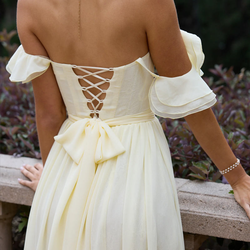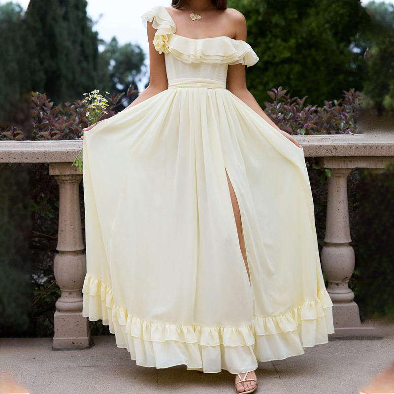 Vestido Maxi Elegante de Gasa con Volantes y Hombros Descubiertos para Mujer, con Abertura Alta y Espalda Corsetada, Ideal para Uso Diario, Formal, Fiestas, Noches y Bodas