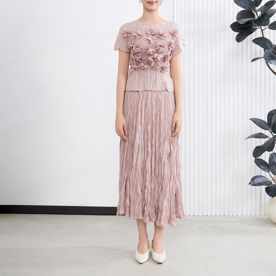 Falda plisada bordada de manga corta para mujer, elegante, sólida, hasta el tobillo, informal, de 2 piezas