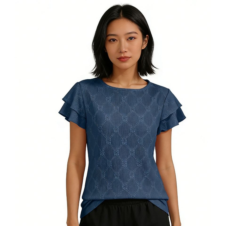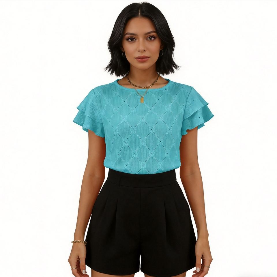 Blusa de mujer con bordado de ojales y mangas con volantes - Camisa de verano de cuello redondo y ajuste holgado a la moda