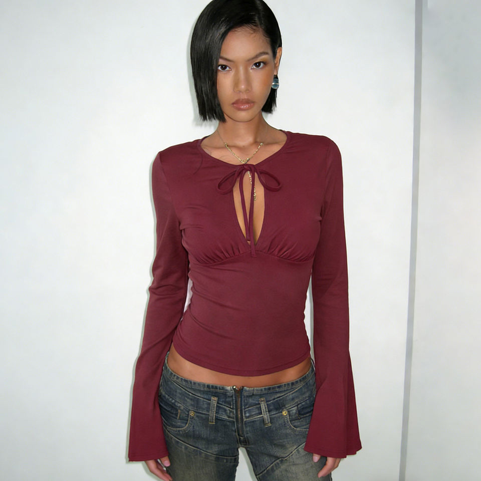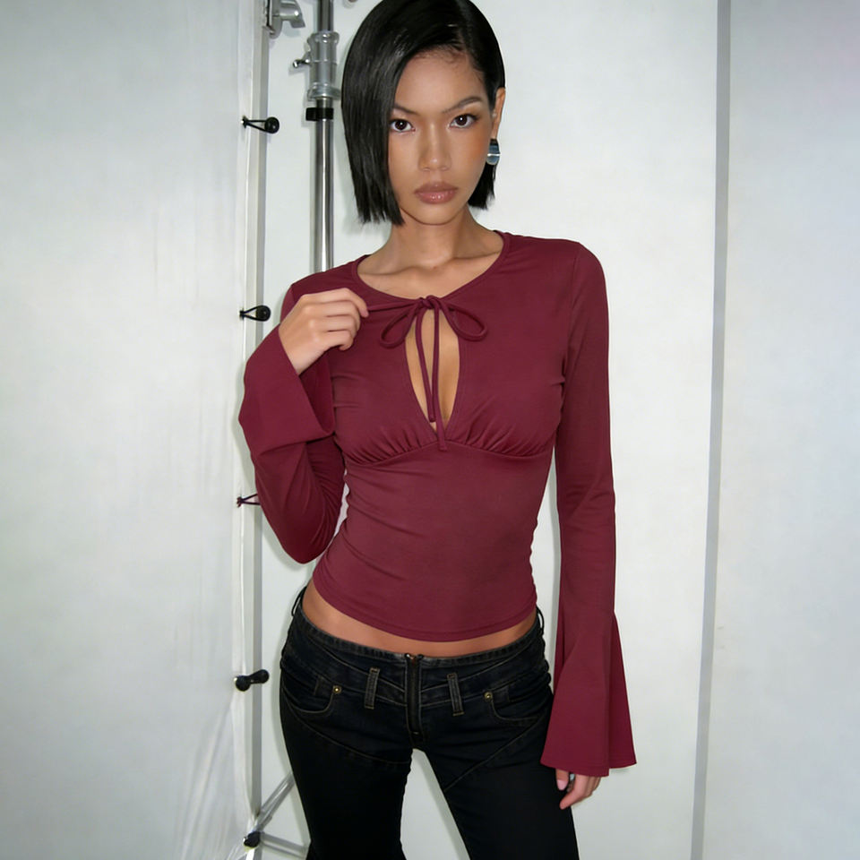 Camiseta de manga acampanada para mujer, de color liso, sencilla, informal, a la moda, para el día a día, con lazo frontal y aberturas fruncidas