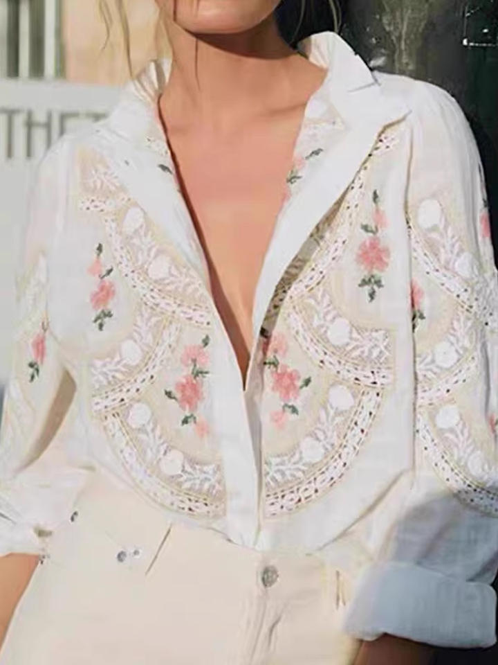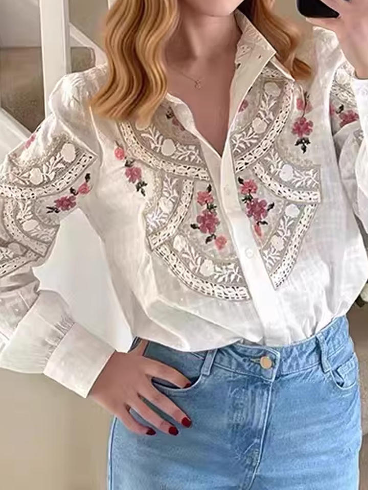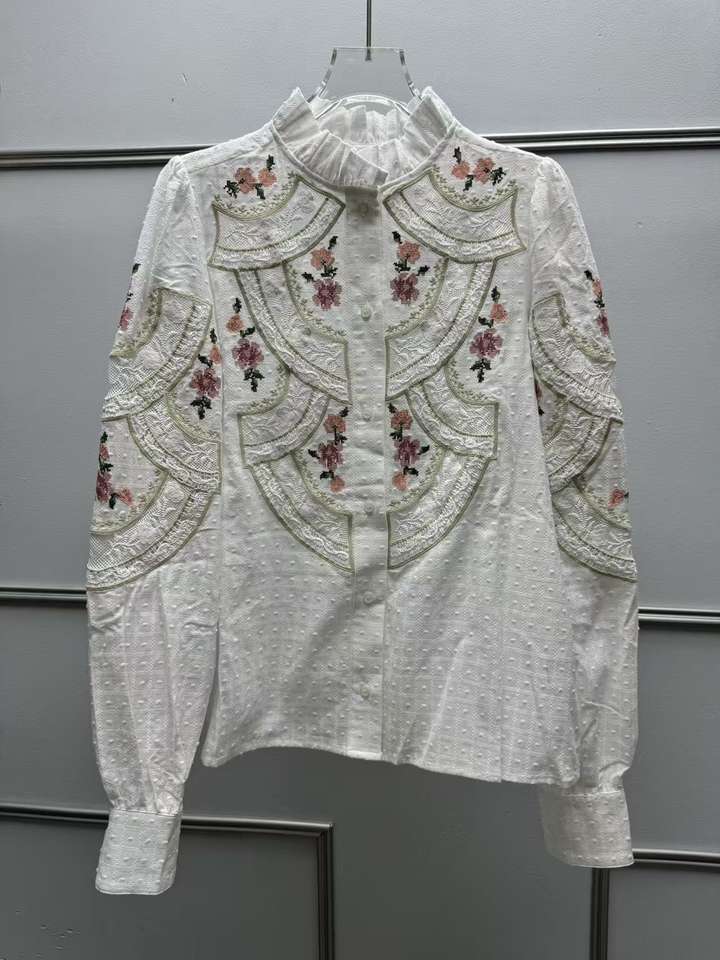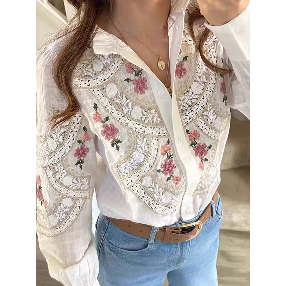 Blusa de Mujer Vintage Francesa Elegante con Volantes, Cuello Alto, Tejido de Punto, Encaje Floral Bordado, Diseño Único, Top ODM