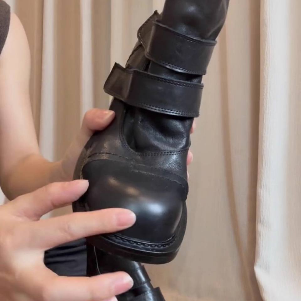 Botines de tacón de bloque de cuero genuino de vaca retro fruncidos para mujer, botas cortas de media pantorrilla con suela gruesa y cierre de velcro