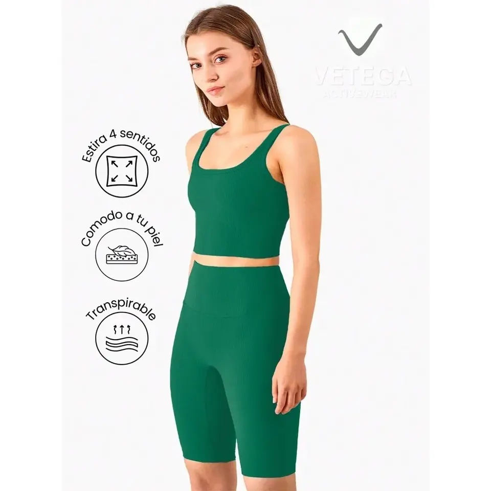 Conjunto Deportivo Verde Acanalado de Alta Elasticidad para Mujer con Top Estilo Biker y Almohadillas Extraíbles 69% Poliamida 31% Elastano Lavado a Mano