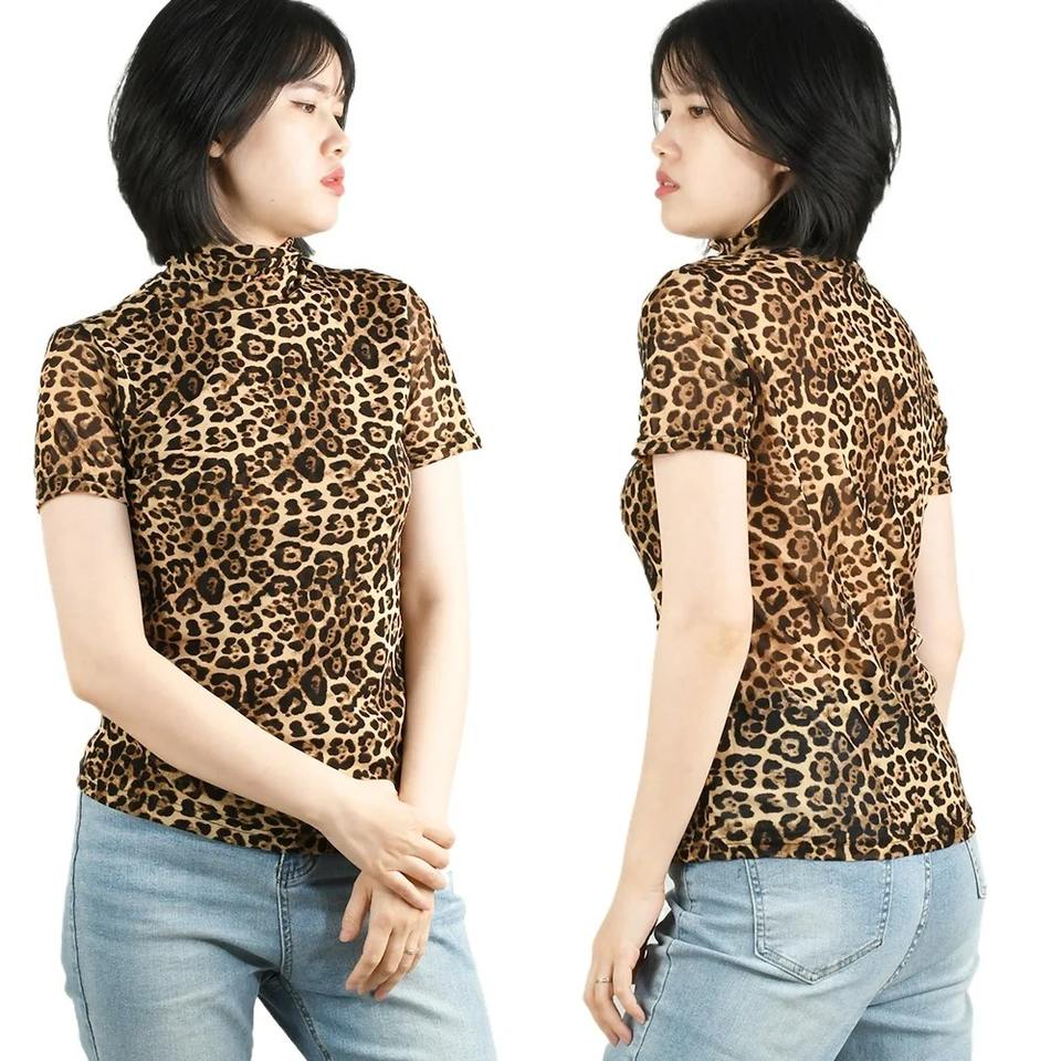 Camiseta de leopardo con Cuello medio alto para mujer, camiseta de malla de manga corta ajustada de otoño, Sexy, cómoda, perspectiva de verano, fondo