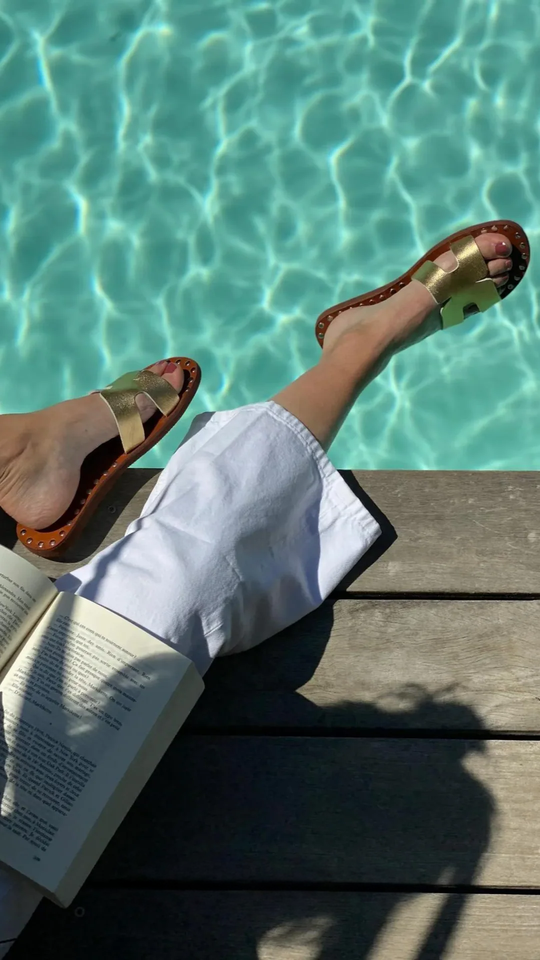 Sandalias Planas de Cuero Genuino Hechas a Mano para Mujer con Entresuela y Suela de Goma, Diseño Marroquí Dorado, Hechas en Marruecos